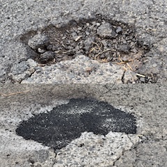 朝、ゴミ捨てに行く途中に路面が陥没している箇所がある。 20x30cmくらいのサイズで、深さは5cmくらい、ロードバイクならパンクしてもおかしくないレベルだ。(画像上半分) ということで、ゴミ出しの途中にLINEで市役所に通報してみた。 近景と遠景の画像と位置情報を送信したら完了だ。 で、2時間後、現場を通ったら、もう補修されてた。(画像下半分) あまりには早いので、もしかしたら他の人が通報してたのかも・・・。
