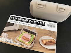 今月ニトリから発売された「レンジグリル ホットサンド」。 ホットサンドメーカーは持ってるんだが、ガスコンロを用意するのが面倒で・・・。 これなら、食パンを挟んでレンジでチンするだけなので簡単だ。 マニュアルでは、600Wで4分とのことだが、パッケージのようなしっかりとした焦げ目はつかなかった。 もうちょっと長くチンすればいいのかな。